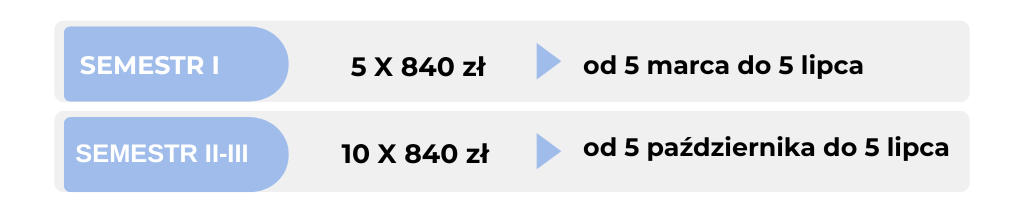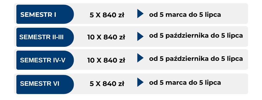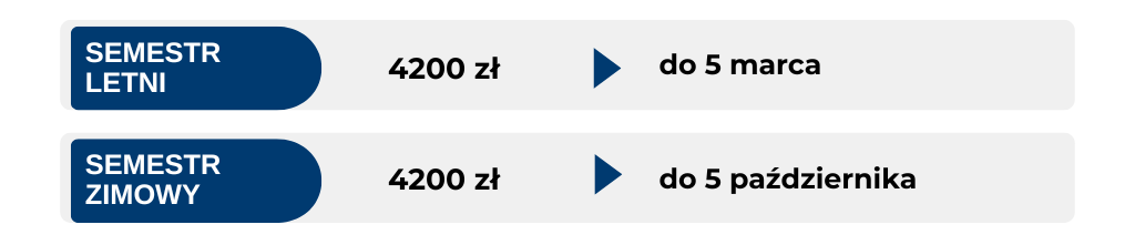 Poniżej przedstawiamy warianty płatności na specjalności Kryminologia i kryminalistyka na kierunku Bezpieczeństwo wewnętrzne — studia licencjackie (I stopnia). Student może opłacać czesne w systemie płatności: miesięcznej, semestralnej (2 raty) lub rocznej (1 rata).